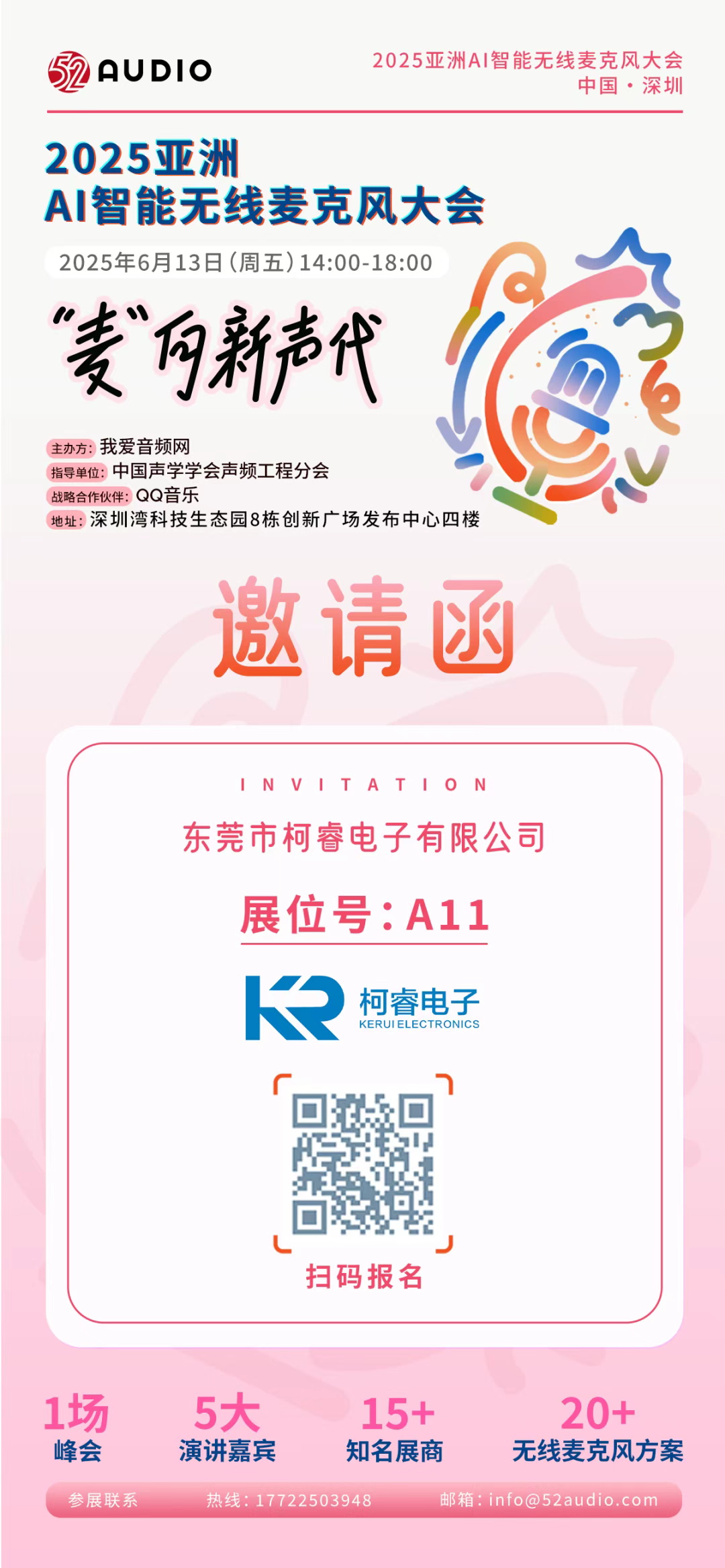 柯睿電子將參加6月13日舉辦的2025亞洲AI智能無線麥克風大會,展位號位于A區A11,屆時歡迎大家蒞臨展位交流。